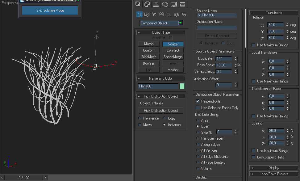 | 36~ bı plane çizip yaprak kaplıyoruz ve bunu "scatter" ile dalların üzerinde çoğaltıyoruz. "scatter" için ben Yukarıdaki ayarları kuallandım. |