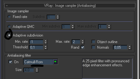 |  | 2~ "Adaptive subdive" seçiyoruz ve "antialiasing" sorunu oluşmasını engelliyoruz. Render boyutu artarsa veya baska bi nedenden dolayı antialiasing sorunu oluşursa değerleri artırıyoruz 3~ Antialiasing filitresi olarak "Catmull-Rom" seçiyoruz ve bu bize daha net render alma olanağı sağlıyor |