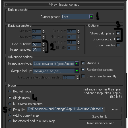|  | 5~ "direct light" kullandığımız için gölge sorunu yaşamadım bu sebepten dolayı irradiance map´ı "low" olarak işaretledim 6~ "HSph subdivs"ve "Interp subdivs" seçenekleri renderda oluşan dumanlanmayı (veya nasıl adlandırılırsa) engeller bunu oluşturan sebeplerden biriside yansıma ile ilgili olan "glossiness" 7~ 3 ile gösterilen seçenekleri işaretleyerek "prepass"ları render sırasında görebiliriz 8~ eğer sadece bir modelin yerini değistirip yada ufak bişey ekleyip tekrar render alacaksanız "irrediance map" kısmındaki "save to file" diyerek prepassları save edebilirsiniz ve sakladığınız dosyayı "browse.."a basarak kullanabilirsiniz ancak bunu kullanmak için "from file"ı işaretlemek gerekir |
