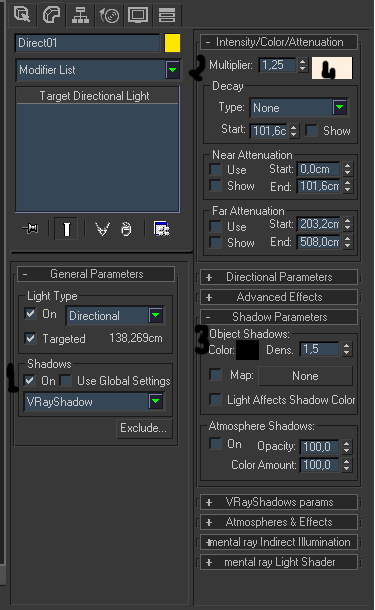 |  | 1~ gölgeyi aktif hale getiriyoruz 2~ ışığın değerini ayarlıyoruz 3~ ışığın rengini güneş ışığı olduğu için biraz kırmızımsı yapıyoruz 4~ "shadow parameter" sekmesinden gölgenin sertliğini ayarlayabiliriz.Bizim 2 ışık kaynağımız gölgeleri aydınlattığı için gölge sertliğini arttırdım |