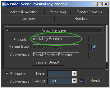 |  | Şimdi F10 tuşuna basıp Render sekmesini açıyoruz ve "Assingn Renderer" Menüsünü açıp" Production" kısmından Mental ray Renderer´i işaretleyip Render motoru seçimimizi yapıyoruz. |