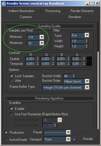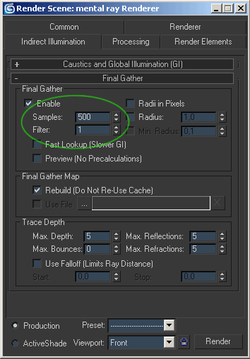|  | Indirect Illımination Butonuna basıp "Final Gather" Kısmını aktif ediyoruz (ışaretli kısımlar defeult ayarlar olup sahne yoğunluğu ve ışık etkilerine göre azaltılabilir yada arttırılabilir bu sahne için yeterli olacağı düşüncesi ile aynen muhafaza ediyorum) |