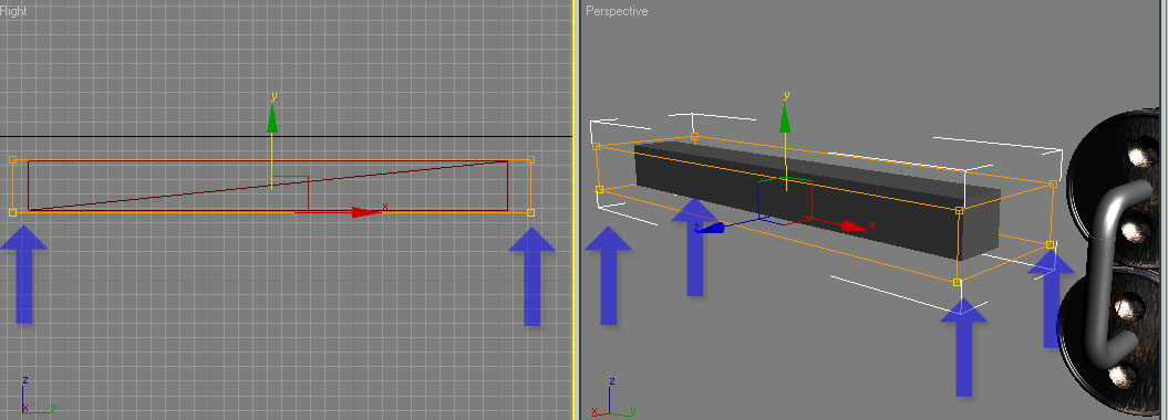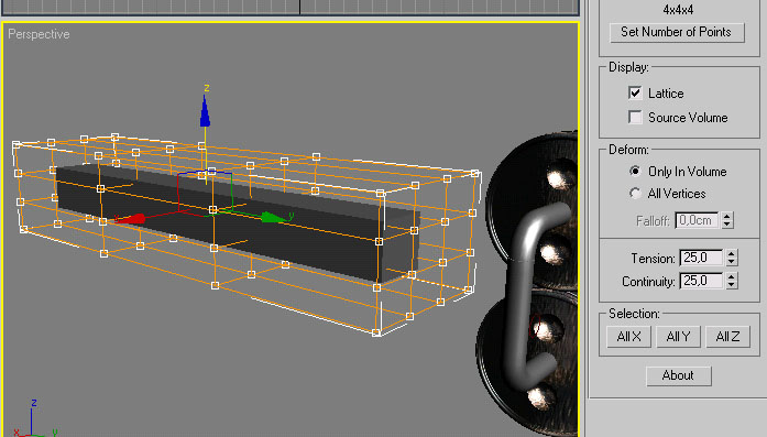 şimdi görülüyorki FFD box´ı ilk yarattığımız anda tam olarak çubuğumuzun ölçülerine uymuyor,(bunu en başta yapmak için uğraşmayın çünkü şimdi yapacağımız gibi sonradan değiştirebiliyoruz)