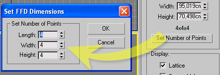 ilk başta FFD(box) 4x4x4 = 64 nokta olarak karşımıza çıkar. Bu bizim için fazla biz bunun sayısını 5x2x2 = 20 ´e düşüreceğiz çünkü işimizi bu kadarı görecektir.