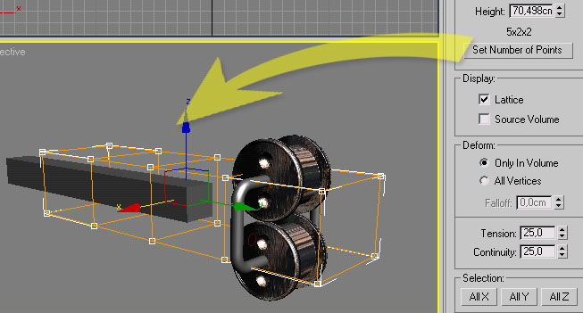 FFD(Box)´a yaptığımız değişiklikler şu anda çubuğumuza yansımayacaktır, bunu sağlamak için çubuğu FFD(Box)´a bağlamamız gerekiyor.