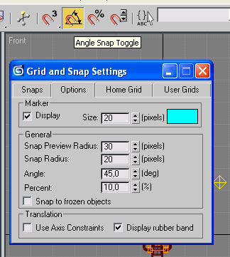 Önce üst toolbar da Angle Snap Toggle sağ klik yapalım, bunun sebebi döndürme işlemlerinde sıkıntı yaşamamk için dönüş hareketlerini 45 dereceye kısıtlamaktır.