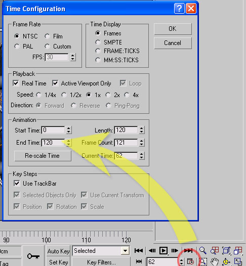 Animasyon zaman çubuğunun sağ tarafında ki Time Configuration tuşuna sağ klik yaparak 100 kare değerindeki zamanı 120 kare yapalım.