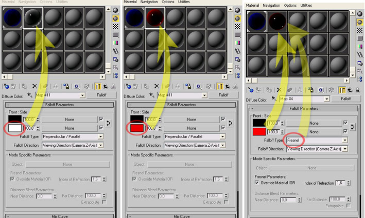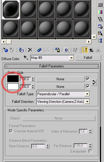 açılan penceredeki siyah ve bayaz renkleri ayarlıyoruz ve Fallof type ´i fresnel olarak değiştiriyoruz.