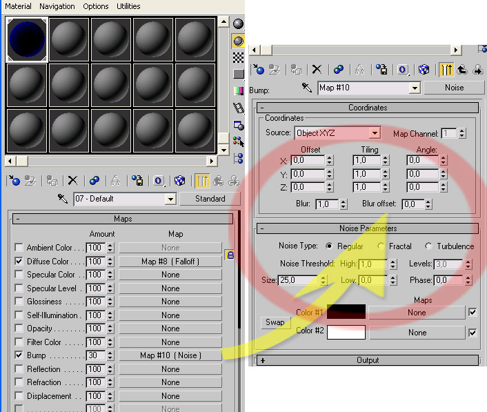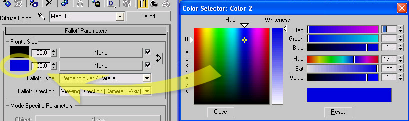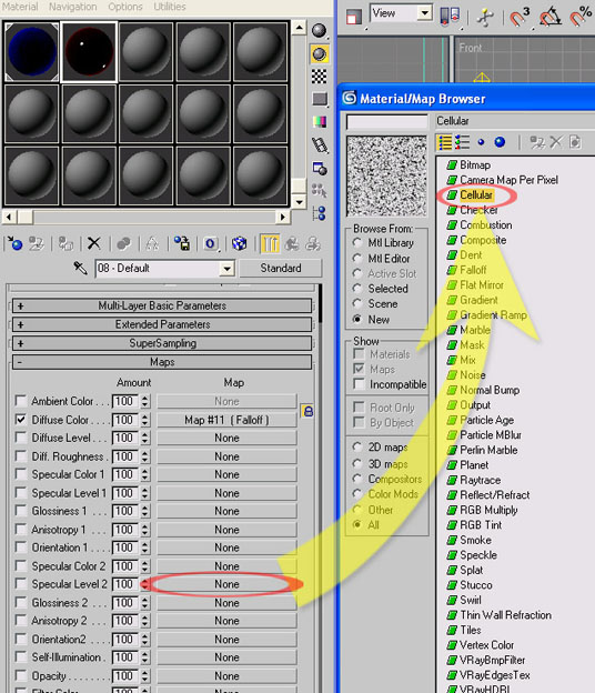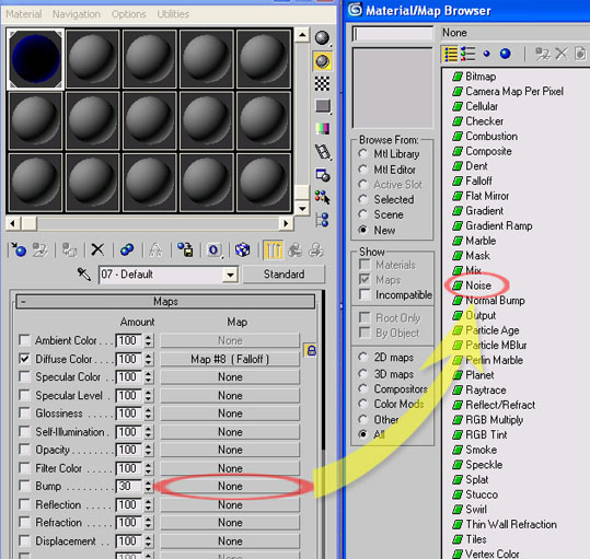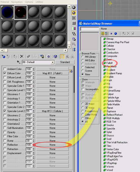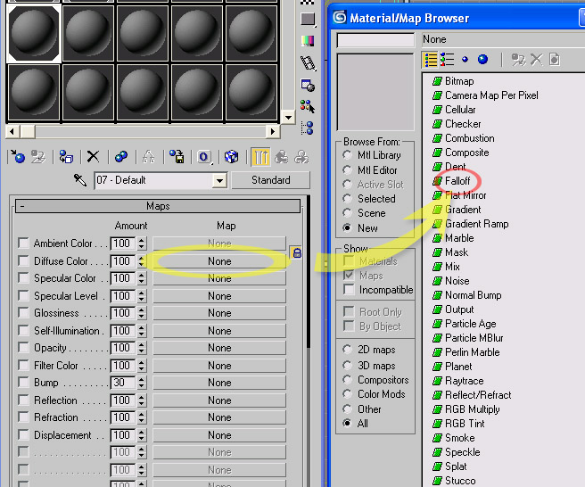 Maps başlığı altındaki kısmı açıyoruz, burada Diffuse color ( none ) butonuna tıklıyoruz. cıkan pencereden fallof çift tıklama ile seçiyoruz.