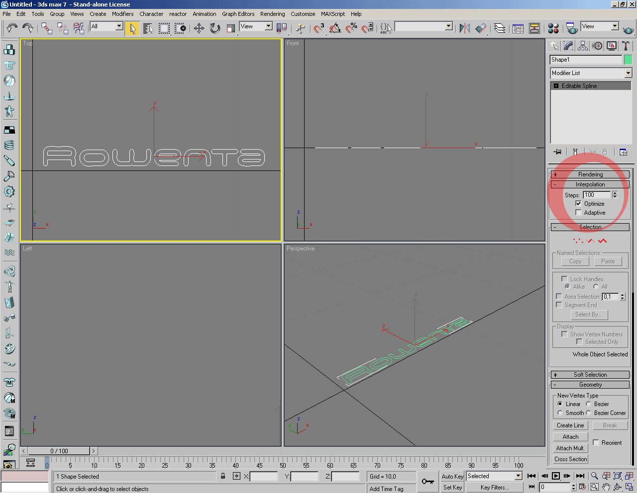 açtığımız yeni dosyanın "editable spline" olduğunu fark etmişsinizdir. Modify panelinden yazının "interpolation" değerini ayarlıyıp dilediğimiz gibi kullanabiliriz artık..