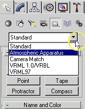 |  | 1-) Meşaleyi çizdikten sonra ateş için gerekli olan spheregizmo yu çizmemiz gerekiyor, bunu için yapım menüsünden, helpers kısmından faydalanıyoruz. kenardaki küçük oka basarak alt listeyi açıyoruz ve listeden Atmospheric Apparatus seçiyoruz |