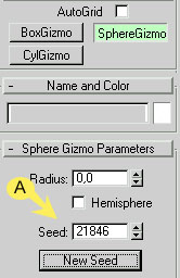 |  | Artık helpers penceresi değişiyor ve buradan Spheregizmoyu seçiyoruz. Spheregizmo yaparken önemli tek nokta Seed değerinin değiştirilmesidir. bunun için new seed düğmesine basmamız gerekir. Eğer bu değeri değiştirmezseniz sahnede yaptığınız tüm meşaleler aynı şekilde yanacaktır. (New seed düğmesi aşağıda A ile gösterilmiştir) |