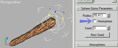 |  | 2-) Dikkat ederseniz bu çizdiğimiz Spheregizmo cismi küre şeklinde oysa bize ateşe benzer bir cisim gerekiyor, bunun için seçeneklerden Hemisphere kutusunu işaretlersek yarım küre olacaktır. |