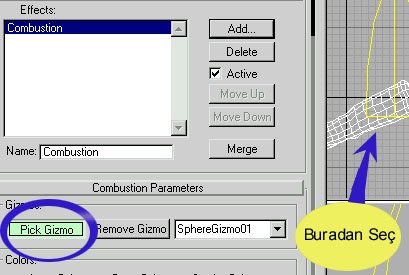 |  | Combustion ekledikten sonra ateşimiz tamam sayılır. Combustion penceresinde alt kısımdan Pick gizmo düğmesine basıyoruz ve yan görünüş penceresinden Spheregizmoyu seçiyoruz, böylece Pick gizmo düğmesinin yanındaki boş kısımda Spheregizmo nun adı çıkacaktır. |