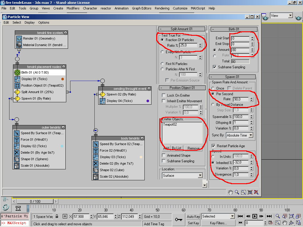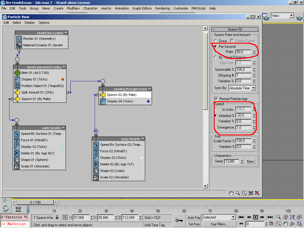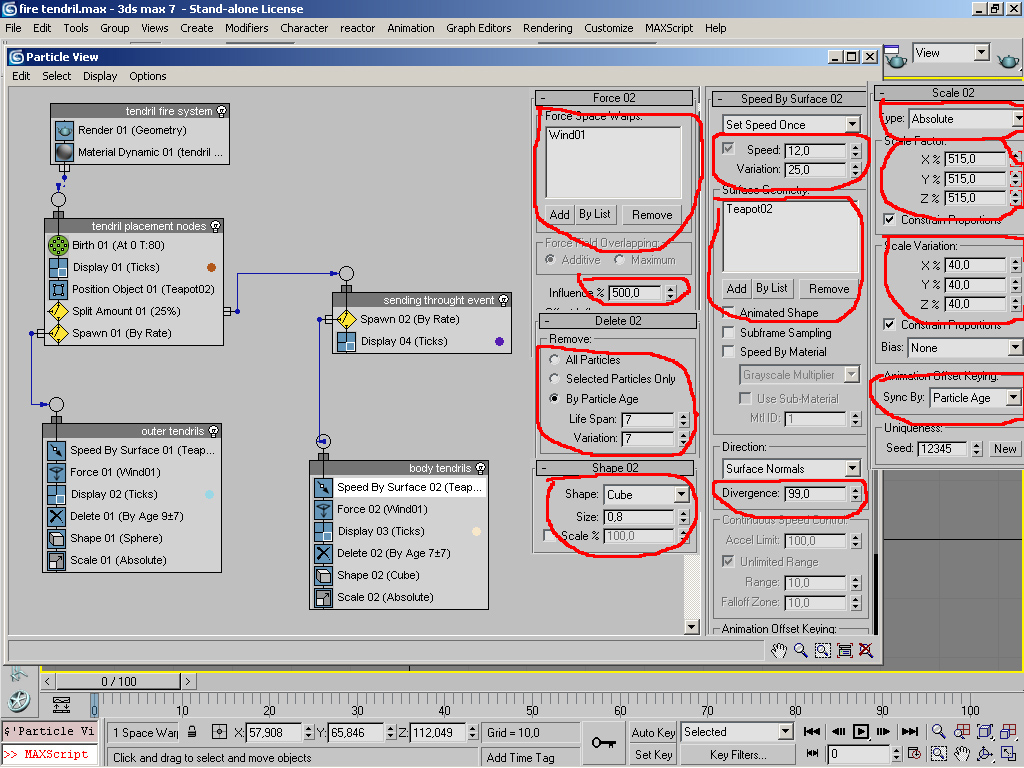 ilk scale animasyonu : frame 0 da 515 yapmıştık.pflow seçili iken autokeye basın , time sliderı 6.frame getirin ve scale ayarlarını (515) 460 yapın.time slideri 12.frame getirin 460 yaptığımız scale ayarını 200 yapın ve auto keyi durdurun
