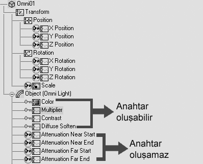 SetKey düğmesinin sağ tarafında Key Filters diye bir düğme göreceksiniz. Bu düğmeye basarsanız karşınıza gelen listede hangi özellikler için anahtar istediğinizi belirtebilirsiniz. Işığın sadece Multiplier değeri ile işimiz olduğuna göre (Properties) sadece Özellikler isimli seçenek işaretli olmalı. Bu seçenekle oluşacak anahtarlar bir ölçüde azalmış olur.