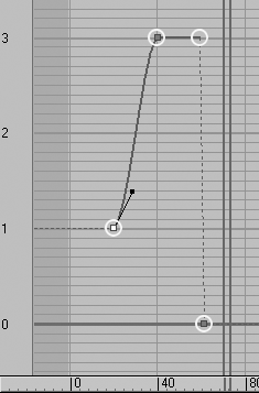 (Curve Editor) Anahtar düzenleme penceresinde gördüğünüz gibi dört tane anahtar istediğimiz gibi oluştu. Dilerseniz ilk anahtarın yanındaki minik kontrol çubuğunu hareket ettirip biraz daha dik bir eğri elde edebilirsiniz.