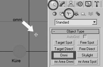 Sahneye bir ışık yapın (resimde gösterilen ışık menüsüne girerek Omni seçeneğini seçin), ışığın sahneye etkisini görebilmek için bir de küre yapın (sphere) Omni ışığını evinizdeki lambalar gibi düşünebilirsiniz. (floresan lamba değil , akkor flamanlı lamba, yoksa armut lamba mı demeliydim) fakat boyut olarak bir nokta kadar küçük haldedir.