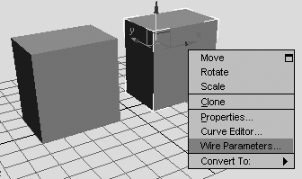 WIRE PARAMETERSFarklı cisimlere ait özellikleri birbiri ile ilişkilendirmek için kullanılır. Burada yapacağımız ilk uygulama için wire parameters aracını kullanmak uygun olacaktır. Wire Parameters ’i direkt açmak için yukarıdaki menülerden Animation menüsüne bakmalısınız. Şu an yapacağımız örnekte kutulara sağ tıklayarak açacağız.