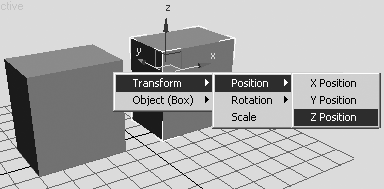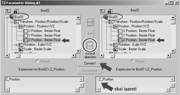 ikinci kutu için Z Position seçeneğini işaretlediğinizde fare işaretçisi + şekline dönüşerek diğer cismi seçemenizi ister. Birinci kutuya tıklayın ve çıkan seçeneklerden yine Transform > Position > Z Position seçeneğini işaretleyin. Şu halde işlem yapacak olursak ikinci kutuyu yukarı götürdüğümüzde birinci kutu da yukarı gidecektir fakat bizim istediğimiz bu değildi. Birinci kutu diğeri ile ters yönde hareket etmeli. Bu pencere size tanıdık gelecektir. Track View penceresinin sol tarafı da bu şekilde görünüyor ve aynı işlemi TrackView ile yapmanız mümkün.