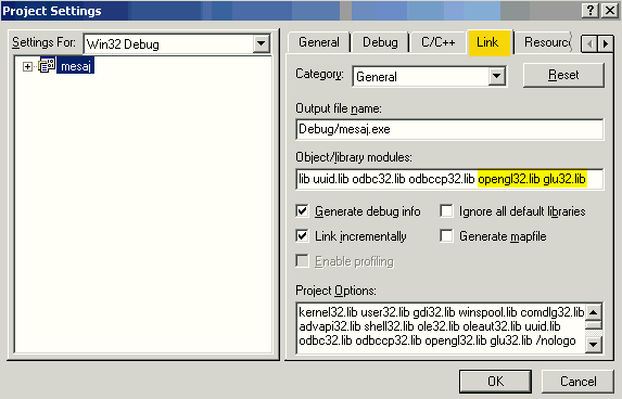 Project>>Settings>>Link kısmından eklemelisiniz. Bunları openGL