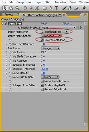 3dsmaxda elde ettiğimiz sahne ölçülerinde yeni bir kompozisyon oluşturduktan sonra original sahneyi ve Z-depth bilgilerini içeren imajı import edip timeline üzerine yerleştiririz. Orijinal imajın üzerine Effect-Blur and Sharpen-Lens Blur efektini ekleriz ve effect control panelden Depth Map Layer i render sonucu elde ettiğimiz Z-Depth map olarak seçeriz. Alttaki menüde ise invert depth map I tıkladığımızda lens blur etkisini tesine çevirebiliriz.