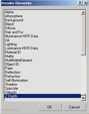 Listede gördüğünüz gib ibirçok render özelliği mevcut. biz şimdilik sadece Z-depth seçip Ok diyoruz.