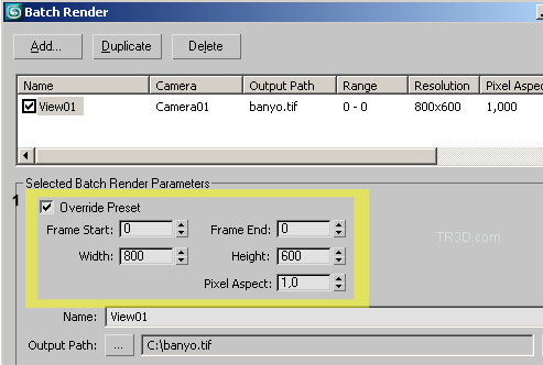 Override preset seçeneği boş ise 3DsMax'in common Render bölümündeki ayarları kabul eder.
