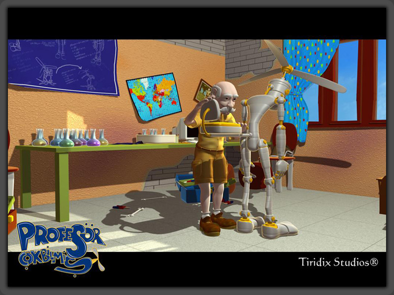Tr3d - Şirketiniz olan Tridix Studios hakkında bilgi verebilirmisiniz.? Halil - Şirketimiz Tiridix Studios (Tiridix Animasyon Stüdyosu ) 2004 yılının başında Mersinde faaliyetine başlamıştır. Şirketimiz 2 ortaklı bir şirkettir. Diğer ortağım aynı zamanda Profesör Çokbilmiş Animasyon filminin yapım koordinatörü ve yapım öncesi ekip amirliğini üstlenen Ayhan ÖZYALÇIN`dır. Tiridix Studios Faaliyetine ilk başladığı yıllarda daha çok firmalar bazında 3d animasyonlar üretiyor ve piyasanın ihtiyaçlarına cevap veriyordu. Kısa ve firmaya özel yapımlar ile 3d animasyon alanında çalışmalarını sürdürüyordu. 2007 yılının başında 180 m2 lik yeni yerimize geçtiğimizde firmalar ile tüm çalışmalarımızı durdurup tamamen kendi projelerimiz üzerinde çalışma kararı aldık ve o tarihten itibarende yeni yerimizde sadece kendi projelermiz üzerine çalışmaya devam ediyoruz. Tr3d - Ekibiniz hakkında neler söyleyebilirsiniz? Ayrıca onları bizlere tanıtabilirseniz çok sevineceğiz ?