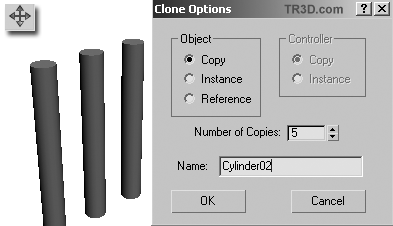 Sahneye bir silindir çizin ve yukarı ok tuşu basılı iken cismi hareket ettirin Karşınıza gelen küçük pencerede Number of Copies (Kopya sayısı) yazan kısma 10 değerini yazıp tamam tuşuna basın. Cismin 10 tane kopyası oluşacaktır. Kopyalama sırasında otomatik isimlendirme yapılacak ve silindir01 , silindir02, silindir03... gibi isimler verilecektir.