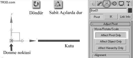 Cismi döndürerek kopyalamayı denemeden önce dönme noktasının yerini değiştirin. Resimde uzun bir kutu çizilerek dönme noktası sol kenara götürülmüştür. Daha sonra Affect pivot Only düğmesini iptal ederek (shift)yukarı ok tuşuna basılı tutun ve kutuyu döndürün. Döndürme işlemi sırasında Angle Snap (Sabit açılarda dur) seçeneğine basarak 15derecelik açı aralığı belirleyebileceğinizi unutmayın. Snap düğmesine sağ tıklayıp bu açı değerini değiştirmeniz mümkün.