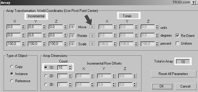 Totals: Kopyalar arasındaki  toplam mesafe(Move), toplam dönme miktarı (Rotate) ve toplam büyüme  miktarını(Scale) belirtir.