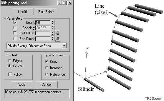 Önce silindiri seçin ve yukarıdaki Tools menüsünden Spacing Tool komutunu çalıştırın. Pick Path düğmesine basarak çizgiyi seçin. Gelen pencere üzerinde Count(Kopya sayısı) değerini girdiğinizde eşit aralıkla çizginin başından sonuna kadar kopya oluşturulacaktır. Eğer kopya sayısı yerine kopyalar arasındaki mesafeyi belirterek işlem yapmak isterseniz Count seçeneğinin yanındaki onay kutusunu iptal ederek Spacing seçeneğini işaretleyin ve aralık mesafesi değeri girin.