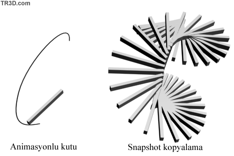 Animasyon verilmiş  cisimleri kaynak olarak kullanıp kopya oluşturur.  Dönerek giden bir tekerleğe snapshot ile  kopyalama uygularsak çeşitli dönme durumlarında tekerlek kopyaları elde ederiz.