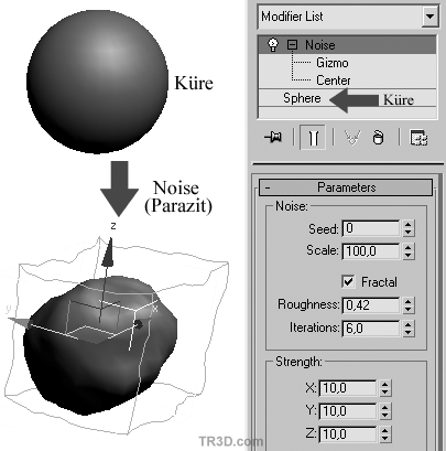 Mesh  üzerindeki noktalara bir yönde kabartı yapmak için kullanılır. Bu modifieri  uygulamadan önce Edit Mesh seçeneği ile cismin Nokta(Vertex) bileşen moduna  geçip Vertexlerin bir kısmını seçip daha sonra Affect Region uygularsanız  sadece seçili olan noktalar bu işlemden etkilenecektir.