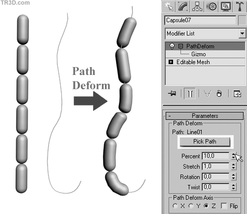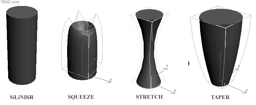 Bu  üç modifier de alt bileşenleri olan Gizmo şeklini  kullanarak uygulandığı cismin yapısını  değiştirir. Yapılan ayarlar gizmonun şeklini değiştirmek içindir. Ayarları  değiştirip istediğiniz bükülme şeklini elde edene kadar uğraşmalısınız.  Sahnedeki cismin boyuna göre farklı ayarlar girildiği için fazla ayrıntıya  girmiyorum. Mofierin uygulandığı cismin Segment sayısının fazla olması daha  etkili bir sonuç verecektir. dört köşe noktası olan bir kutuya uyguladığınızda  Squeeze ve Stretch modifierlerinin etkisini göremezsiniz. Segment sayısın  ıarttırıp arada da kenarlar ve noktalar olmasını sağladığınızda etkiyi  görebilirsiniz.