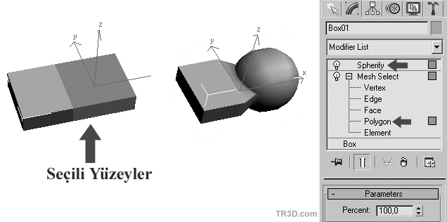 Cismin seçili bir kısmına modifier uygulamaya bir örnekle bakalım. Önce bir kutu çizin , segment değerlerini 16x16x16 şeklinde yükseltin.ve buna Mesh Select Modifieri uygulayın. Polygon moduna geçerek kutunun yarısını seçin ve Modifier listesinden Spherify seçeneğini açın. Percent değerini arttırdığınızda sadece seçili kısmın etkilendiğini göreceksiniz.