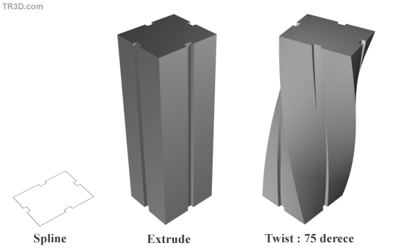 Belirtilen açı miktarına göre cisim  üzerinde dönme etkisi yapar. Gizmonun şekli oluşacak şekil hakkında fikir  verecektir. Eğer bu modifieri uygulamadan önce bazı yüzeyleri seçersenzi sadece  o yüzeylere uygulanır. Cisim üzerindeki Segment(Boylamasına Kenarlar) sayısı az  olursa etkisini tam görmek mümkün olmaz.