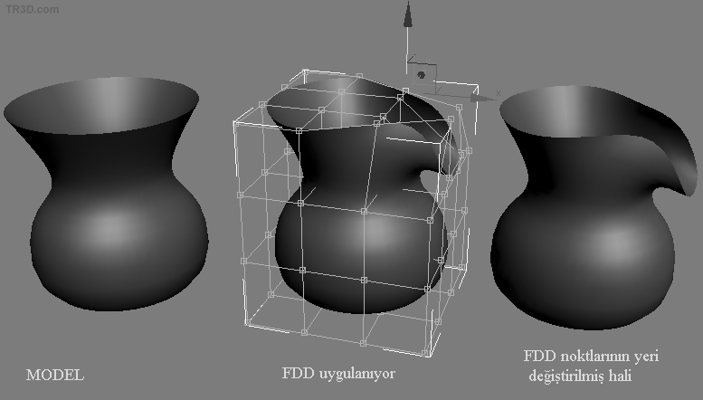 Cisim  üzerindeki noktaların yerini daha kolay değiştirmek için kullanılan bir araçtır.  Bu modifier cisme uygulandıktan sonra   alt bileşenlerinden Points seçilerek kontrol noktalarının yeri  değiştirilirse cisim üzerindeki noktalar da uygun şekilde değişecektir. FFD  2x2x2 , FFD 3x3x3 , FFD 4x4x4 , FFD Box ve FFD Cyl , aynı  özellikteki araçlardır. tek far kontrol  noktası sayısı ve noktaların duruşudur.