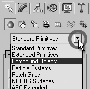 Önce Birleşik Cisim oluşturmak için kullanılan sistemlere genel bir bakış yapalım, Bölüm sonundaki örnek uygulamaları yaparak araçların kullanımını ayrıntılı şekilde öğrenebilirsiniz. Birleşik cisimlere ulaşmak için üç boyutlu cisim oluşturma kısmındaki açılan listeden Compound Objects seçeneğini seçmelisiniz.
