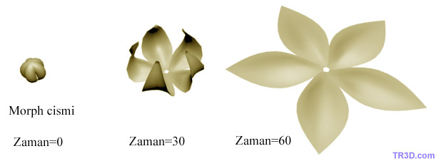 Morph işlemine gelince: Önce tomurcuk halini seçin ve Morph düğmesine basın, Zaman çubuğunu 20 ye götürüp Sağ taraftaki Pick Target düğmesine basıp çiçeğin yarı açılmış halini seçin. Zaman çubuğunu 40'a götürüp Pick Target düğmesine basın ve çiçeğin tam açılmış halini seçin. Animasyonu izlemek için zaman çubuğunu fare ile tutarak ileri ve geri götürün.