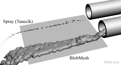 Diğer resimde ise SuperSpray isimli tanecik sistemine BlobMesh uygulanmıştır. Kısa zamanda etkili akışkan ainmasyonları yapmakta kullanılabilir. Taneciklerin kullanım özellikleri çok daha geniş imkanlar sunacaktır.