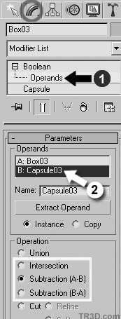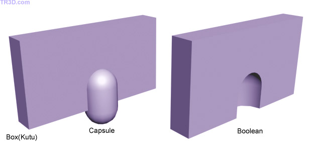 Resimde bir duvara oyuk açmak için bir Capsule cismi kullanılıyor. Kutu yaptığınız kısmın altındaki Extended Pirimitives kısmından Capsule cismini oluşturabilirsiniz. Önce kutuyu seçip Boolean düğmesine basın ve Pick Operand B düğmesine basarak capsule cismini seçin. Böylece yüzeyde kapsül ile aynı boyda olan bir oyuk açılacaktır.