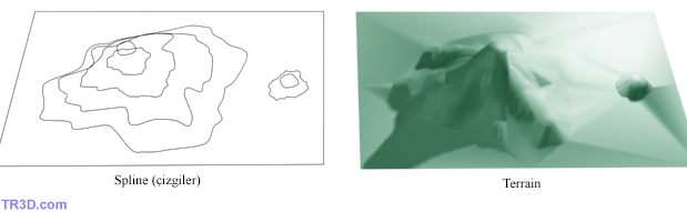Harita  benzeri bir kaynak kullanarak zemin yüksekliklerine göre üç boyutlu cisim  oluşturmakta kullanılır. Öncelikle kaynak çizgiler hazırlanır ve birleşik  cisimler kısmına geçilerek çizgilerden biri seçili iken Terrain düğmesine basılır.  Sonra Pick Operand düğmesine basarak diğer çizgiler seçilir.