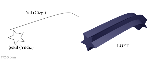 Bir  yol üzerinde çizgiyi hareket ettirerek kapalı şekil oluşturur. En az iki  çizgiye ihtiyaç duymaktadır. Çizginin biri yol diğer ise yol boyunca hareket  ettirilecek şekil olacaktır. Resimdeki örnekte bir yıldız düz bir çizgi boyunca  hareket ettirilip mesh cismi oluşturulmuştur. Loft üzerindeki çeşitli noktalar  için farklı şekiller tanımlamak mümkündür. cismin başına yıldız olarak seçilen  şekil cismin sonunda daire olarak seçilebilir. Böylece oluşan cisim iki şekil  arasında geçiş görünümünde olacaktır. Loft cisminin özelliklerini konunun  sonundaki Tüp Krem uygulaması ile öğrenelim.