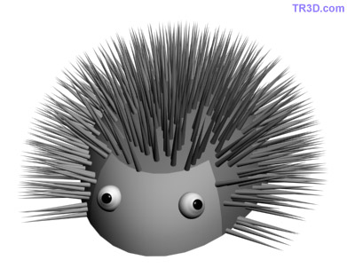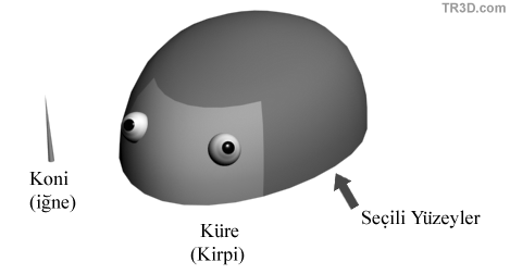 Örnek sahnemizde bir küre oluşturdum ve kürenin oluşturma özelliklerinden Hemisphere(Yarıküre) seçeneğine 0,5 değeri girdim. böylece yarım bir küre oluştu. Küreye FDD modifieri uygulayarak şeklini biraz uzattım ve ön tarafa iki küre daha kullanarak gözlerini yaptım. Kirpi modelimizin sadece sırtında diken olacağı için Yarım küreye Edit Mesh Modifieri uygulayıp tepeden görünüm penceresinde sırtından bir bölüm seçtim ve o halde bıraktım. (Bununla ilgili dosyayı CD içersinde bulacaksınız)