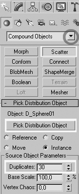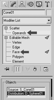 Eğer  iğne veya küre üzerinde değişiklik yapmak istiyorsanız instance seçeneği ile  sınırlı değilsiniz. Düzenleme kısmına geçin ve Scatter yazısının sol  tarafındaki küçük (+) işaretine tıkalyıp alt bileşeni olan Operands seçeneğini  tıklayın. Alt kısımdaki seçeneklerden Objects kısmına dikkat edin burada  koninin ve yarım kürenin adını görebilirsiniz. Bunlardan birini seçtiğinizde  yukardaki  düzenleme kısmından seçtiğiniz  birleşik cismin parçalarını veya özelliklerini değiştirmeniz mümkün.