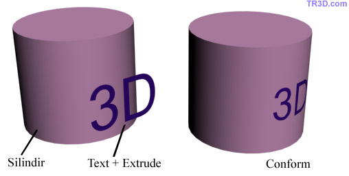 Şekildeki örnekte Text ile iki boyutlu bir yazı yazılmış ve extrude ile kalınlık verilmiştir. Yazıyı silindir üzerine yapıştırmak için yazı seçili iken Conform düğmesine tıklanır ve Pick Wrap-to Object düğmesine basarak silindir seçilir. Yapıştırılacak cisim ve yüzeyin konumuna göre aşağıdaki Vertex Projection Direction(Noktaları hizalama yönü) Seçeneklerinden uygun olanını seçmek gerekir. Şekildeki gibi bir sahnede Towards Wrap- to Center seçeneği uygun olacaktır. Alt kısımdaki Hide wrap to Object seçeneğini işaretleyerek sadece yazının görünmesini sağlamalısınız.