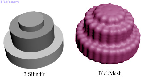 Resimde sadece üç silindir üst üste konulmuş ve BlobMesh uygulanmıştır. Kısa zamanda pasta yapmak için iyi bir yöntem. Yüzey sayısı çok fazla olursa Optimize modifieri uygulayıp azaltabilirsiniz.