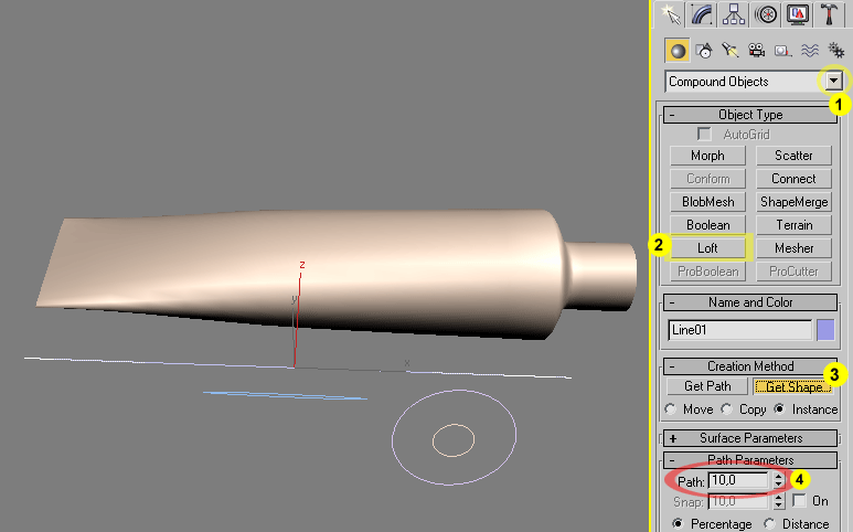 Aşağıdaki şekilde Loft yapılırken birkaç farklı kesit seçilerek krem tüpü yapılmıştır. Bunu yapabilmek için önce uzun çizgi ceçili iken loft düğmesine basın. 4 numaralı adıma geldikten sonra :